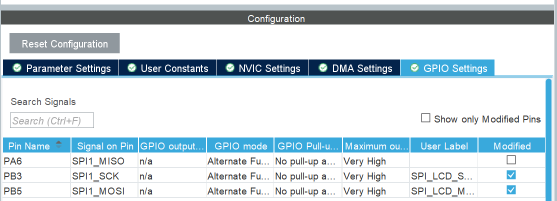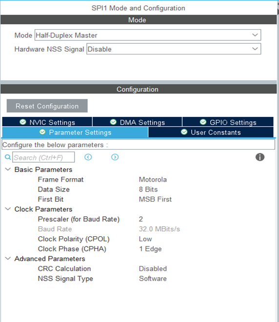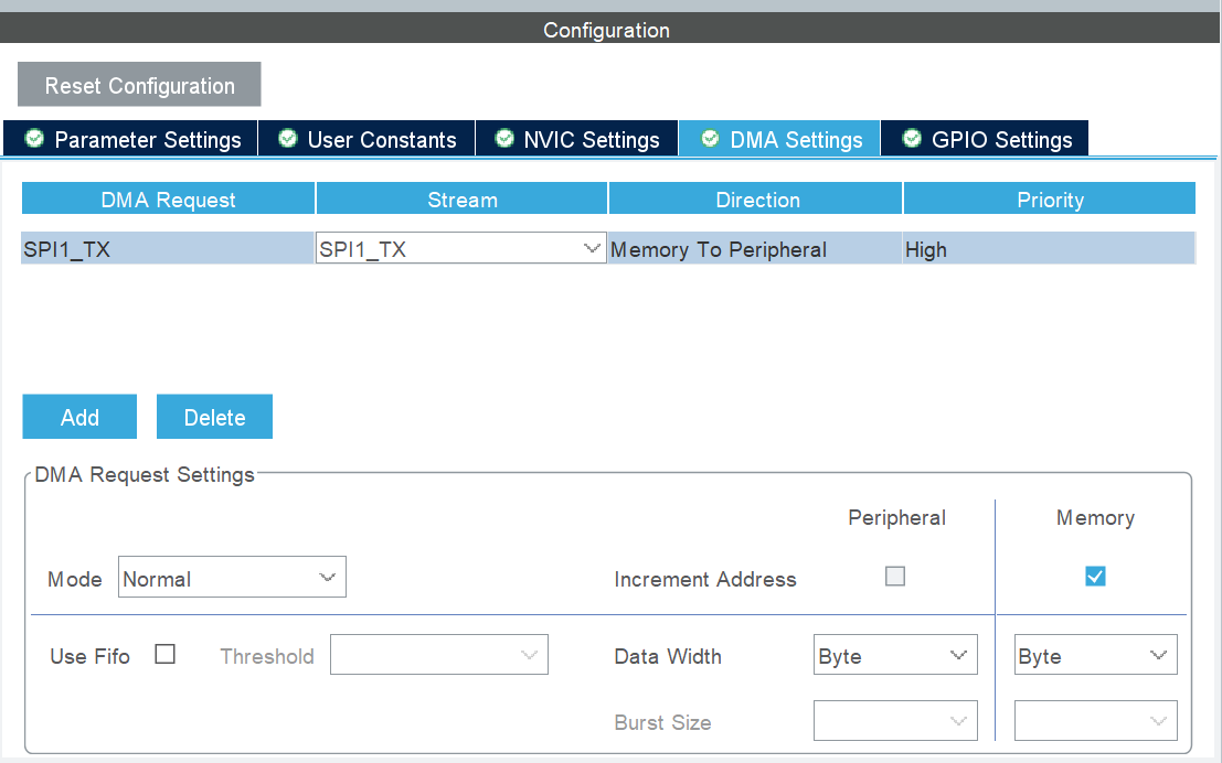 - SPI1_TX: Mem-to-Periph, Priority High, DataWidth=Byte, Normal