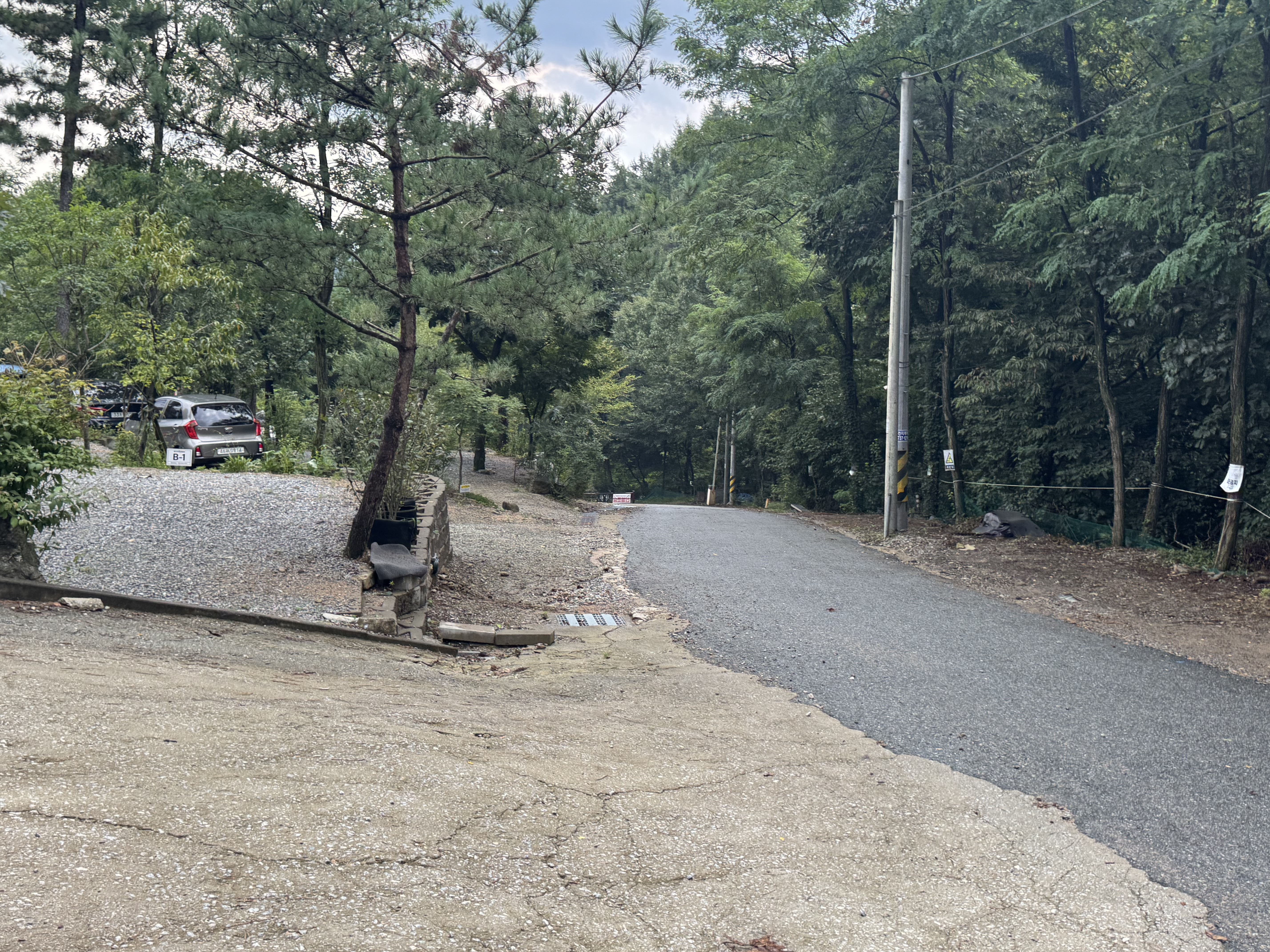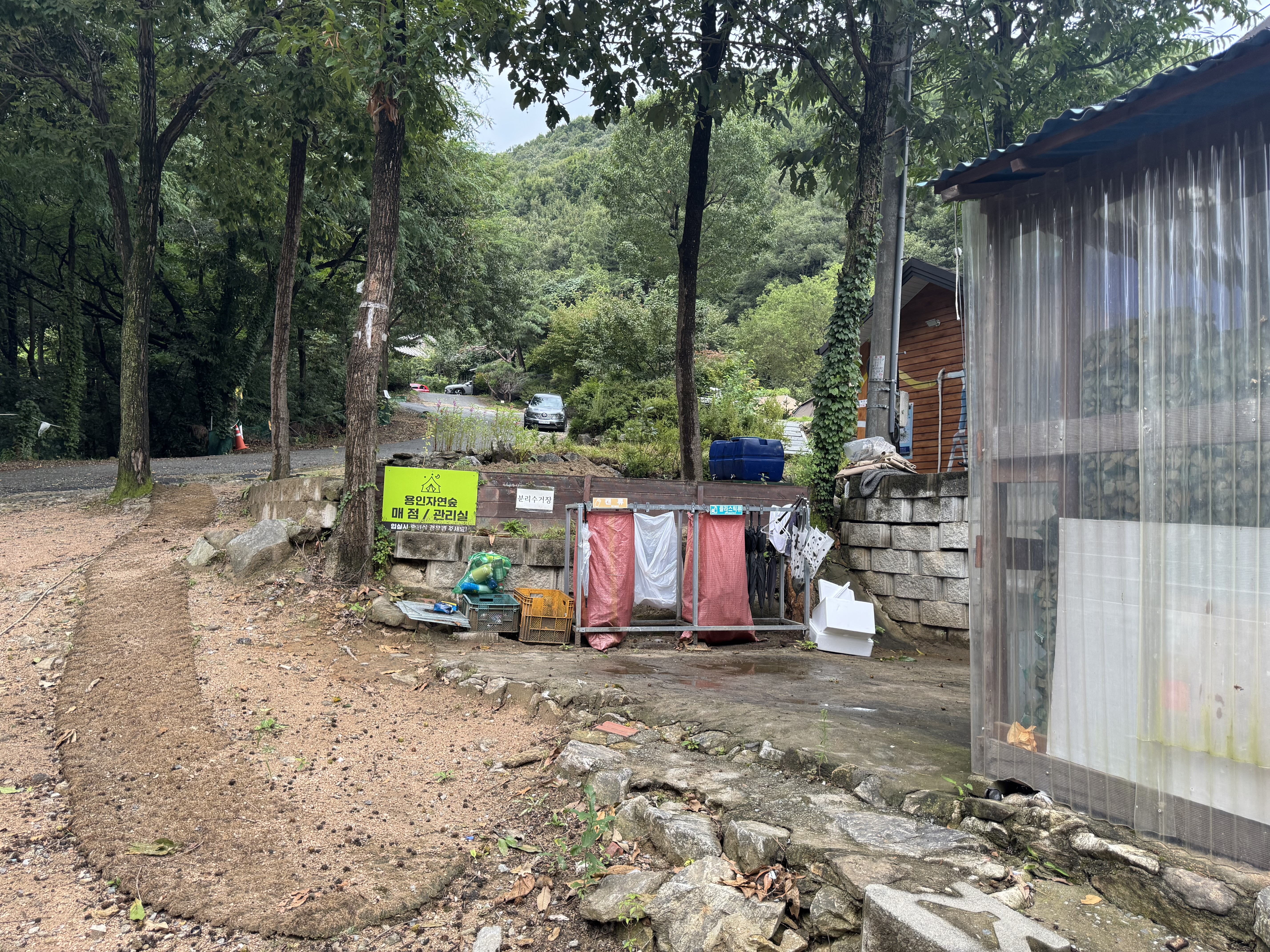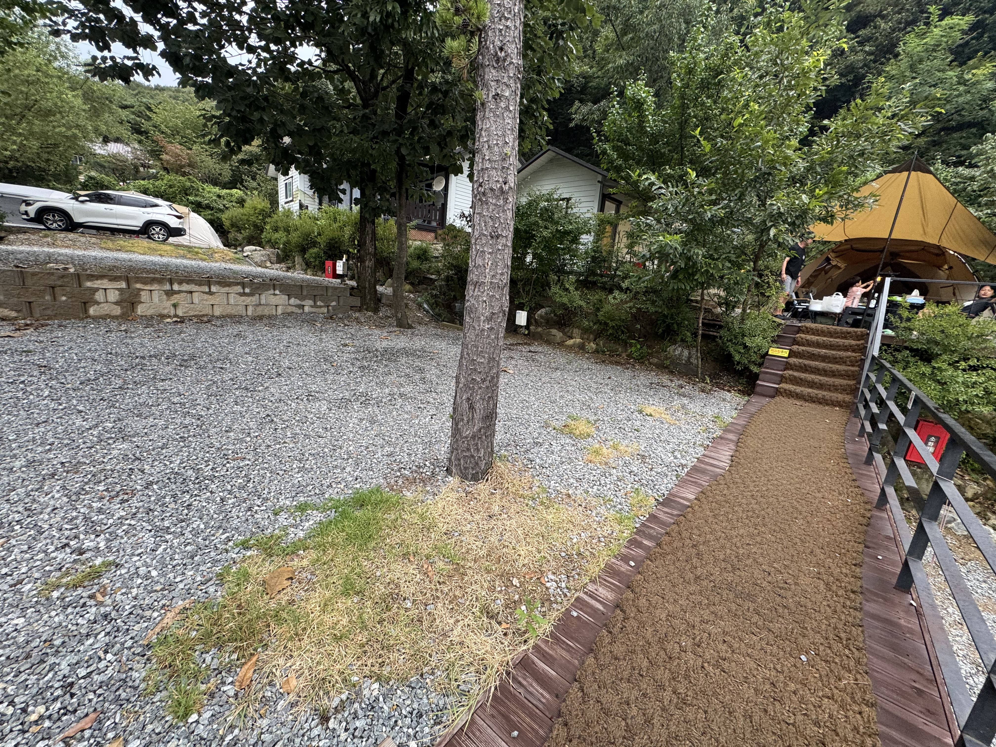 캠핑장 입구 초입이다. 사이트옆 주차가 안되는 사이는 짐을 옮기고 저렇게 길가 주차를 한다.