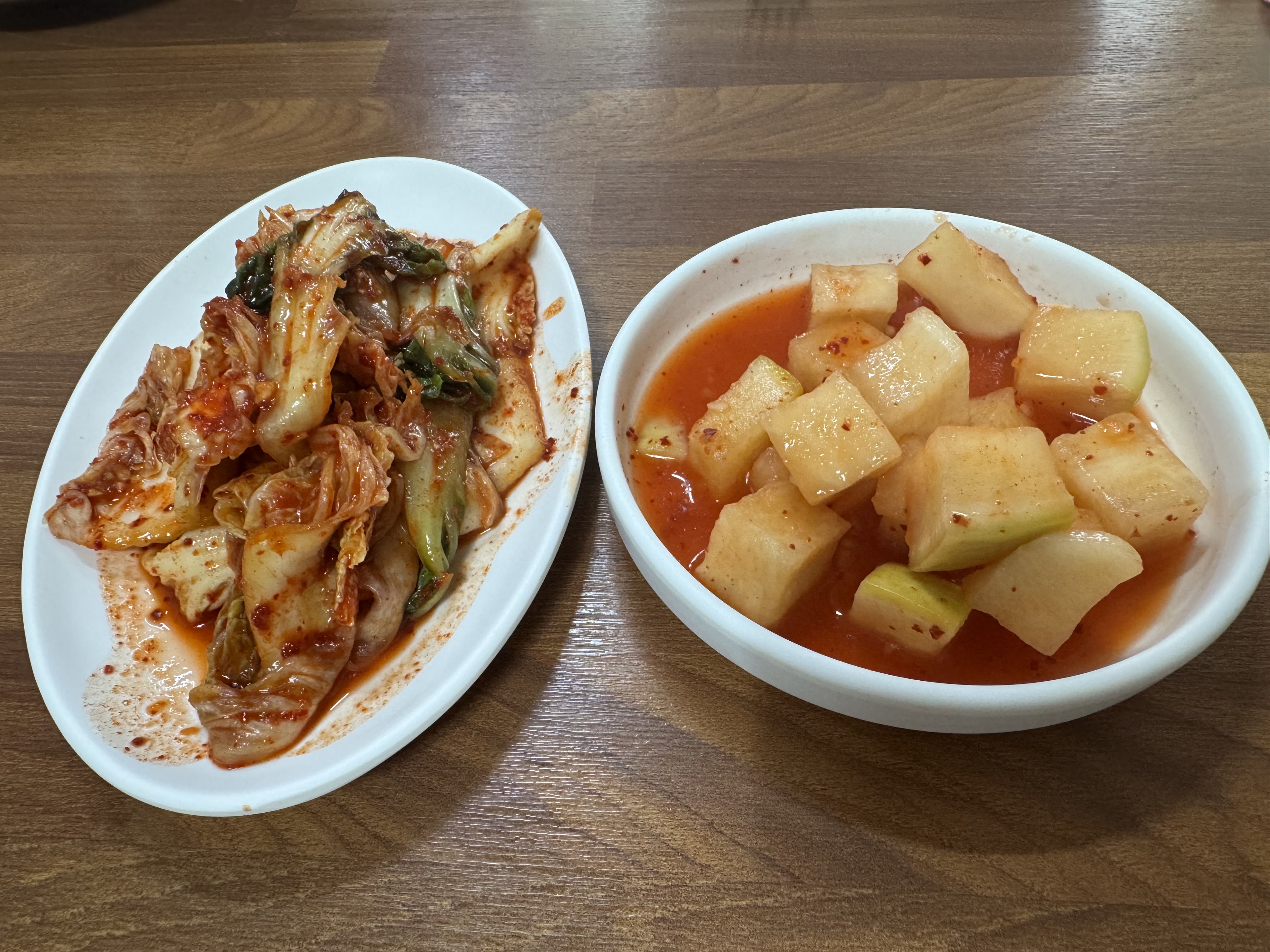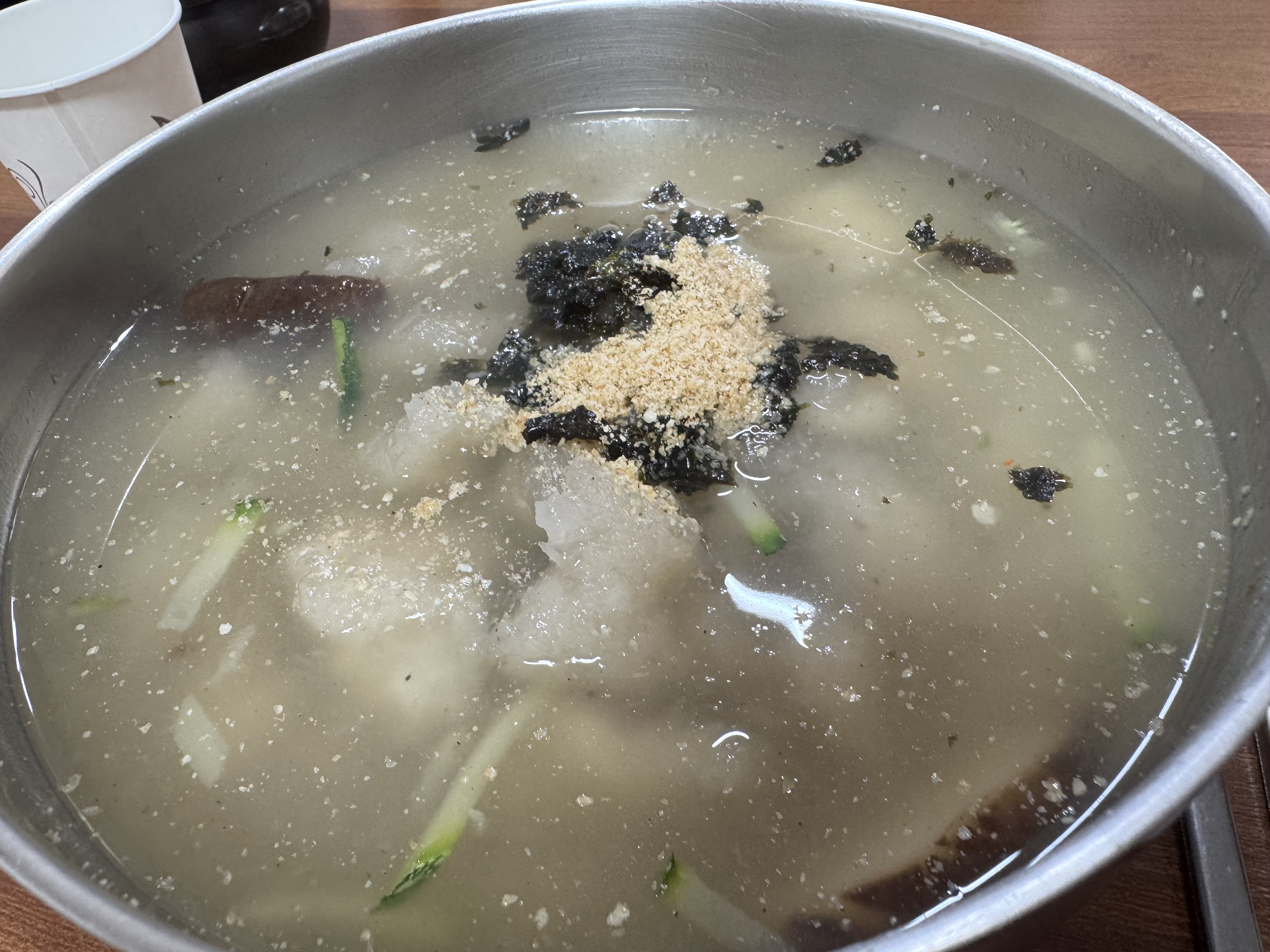 생각보다 옹심이가 많이 들어가 있고 성인남성이 배부르게 먹을 양이다. 김치가 아주 맛있고 쌀떡 궁합이다.