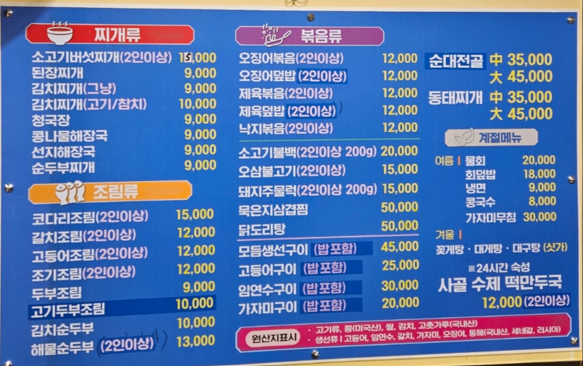 찌개, 볶음, 조림, 생선구이등 메뉴가 다양하다.