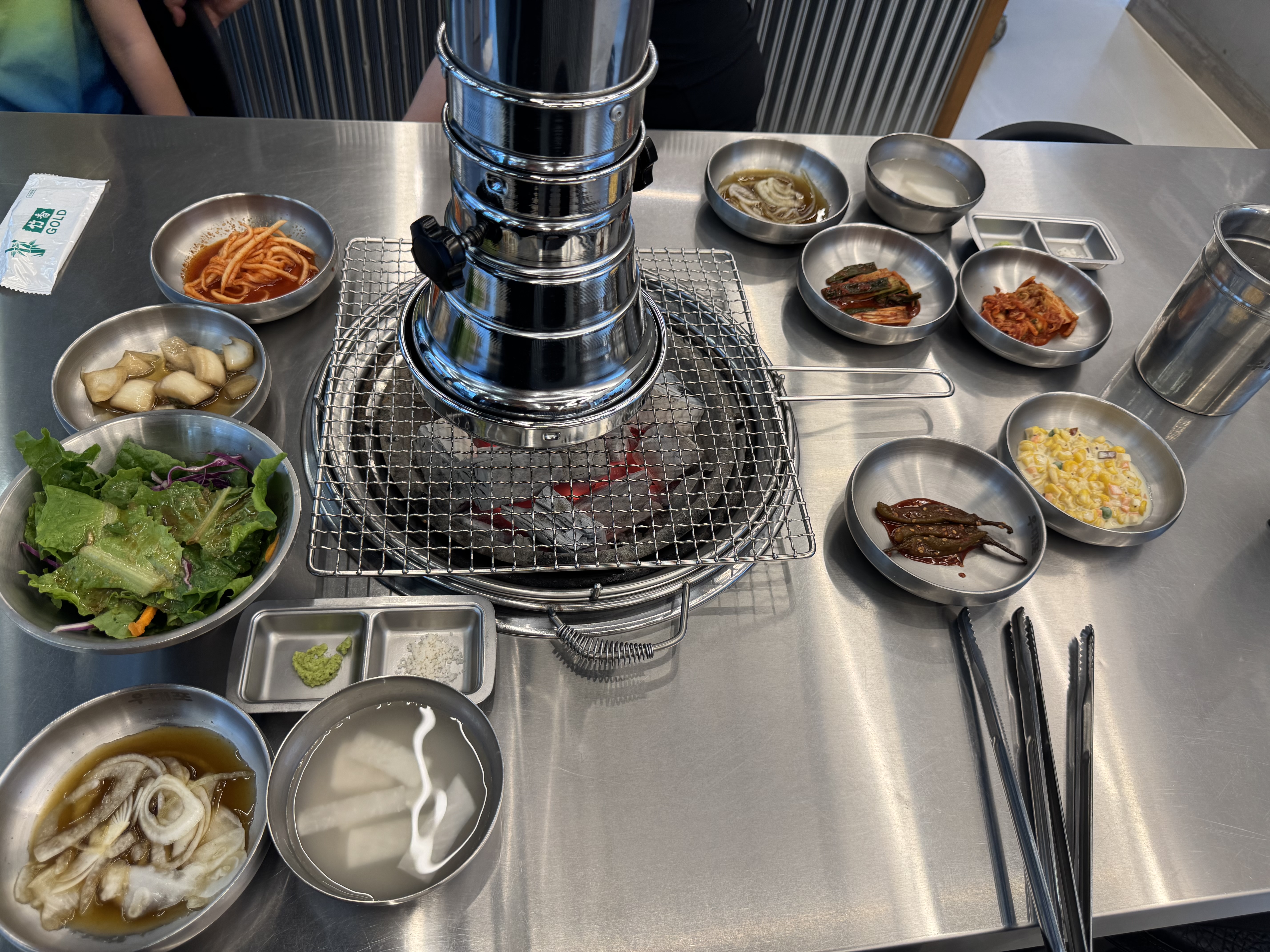 기본 세팅이며 무생채, 겉절이, 고추 옥수수, 양파절임, 김치등이 있다.