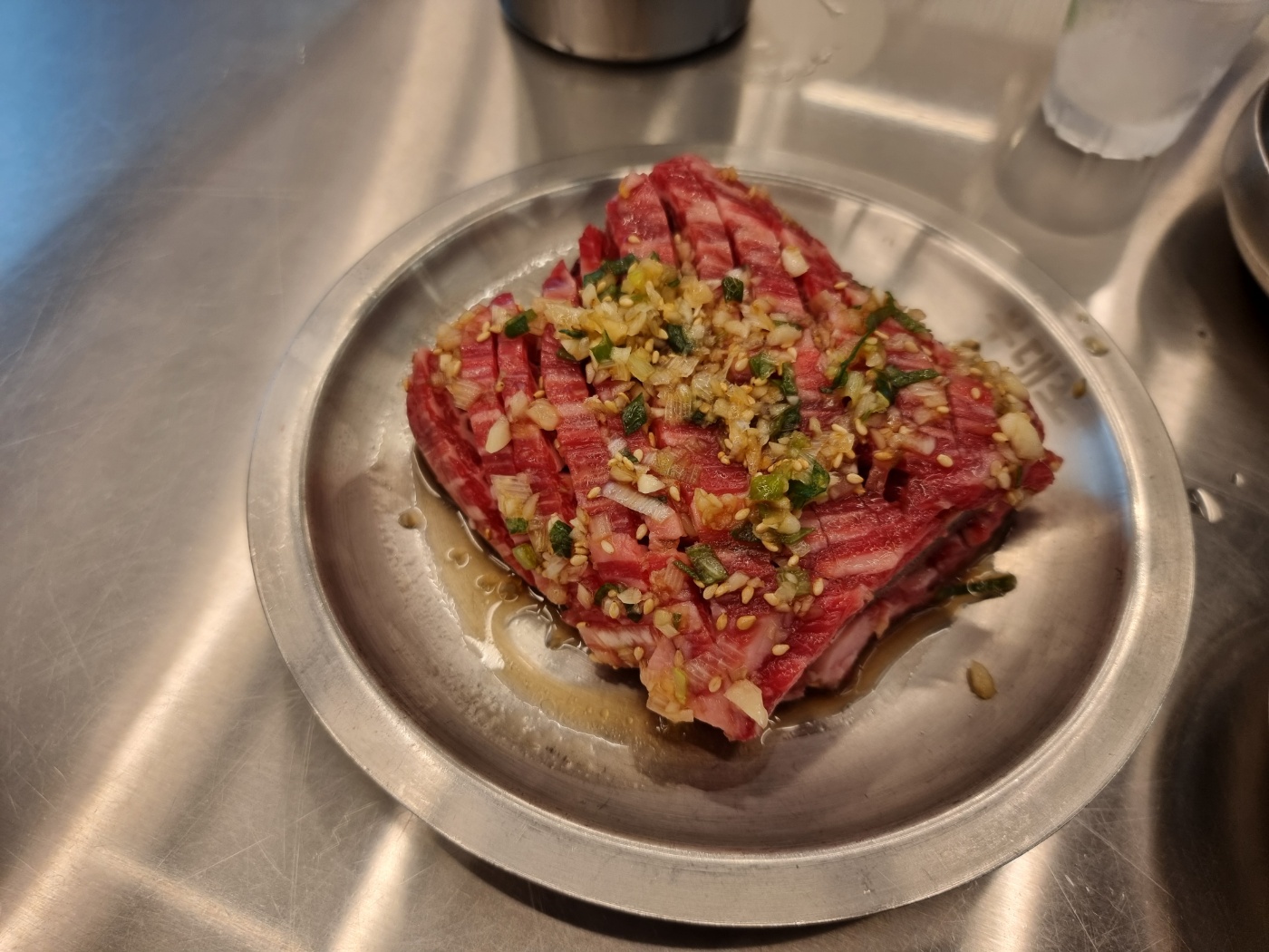 생갈비 때깔이 아주 좋다. 생갈비와 양념갈비를 시켰으며 생갈비를 먼저 먹고 양념을 먹는게 순서라고 하신다.