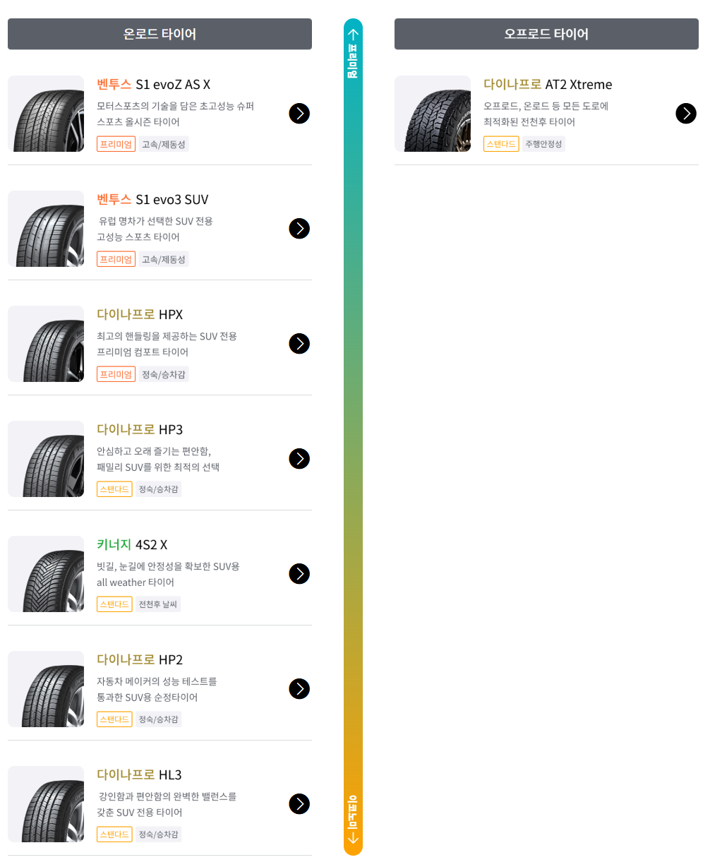| 35만 원 이상 | Dynapro XT, Ventus S1 evo Z SUV | 오프로더·고출력 SUV용, 고강성 사이드월·극한 주행 성능 | 지프, 랜드로버, 고성능 수입 SUV |