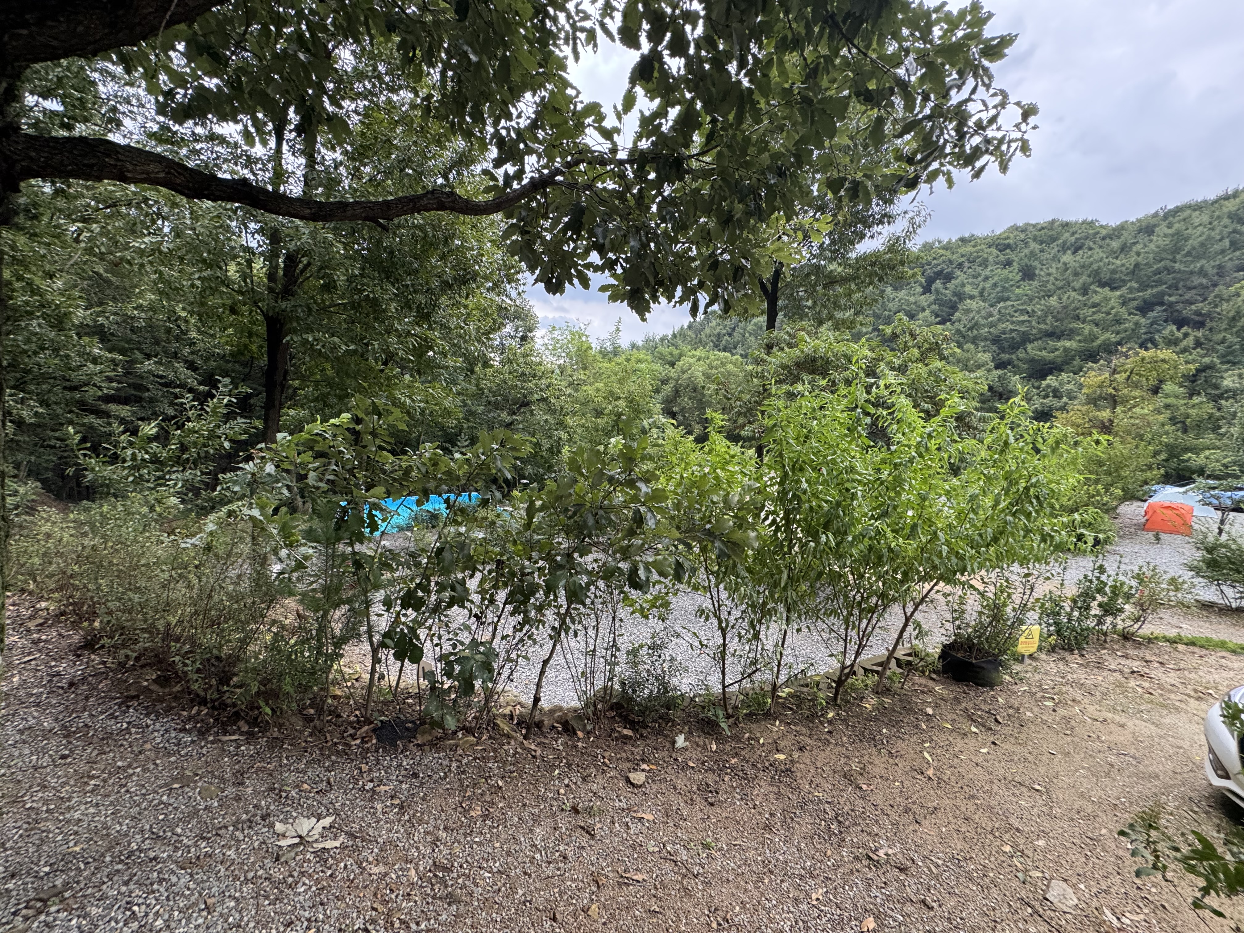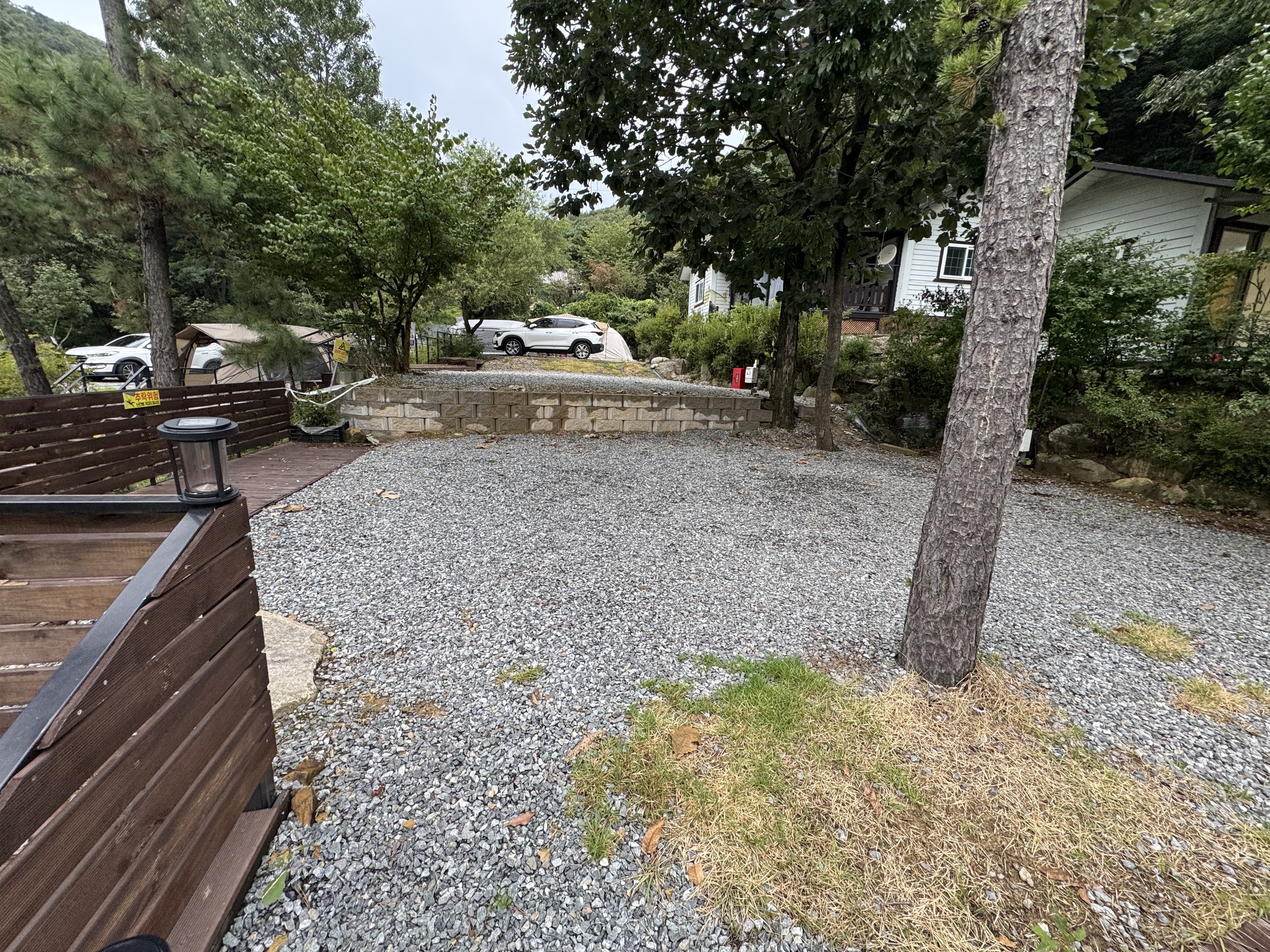 캠핑장 입구 초입이다. 사이트옆 주차가 안되는 사이는 짐을 옮기고 저렇게 길가 주차를 한다.