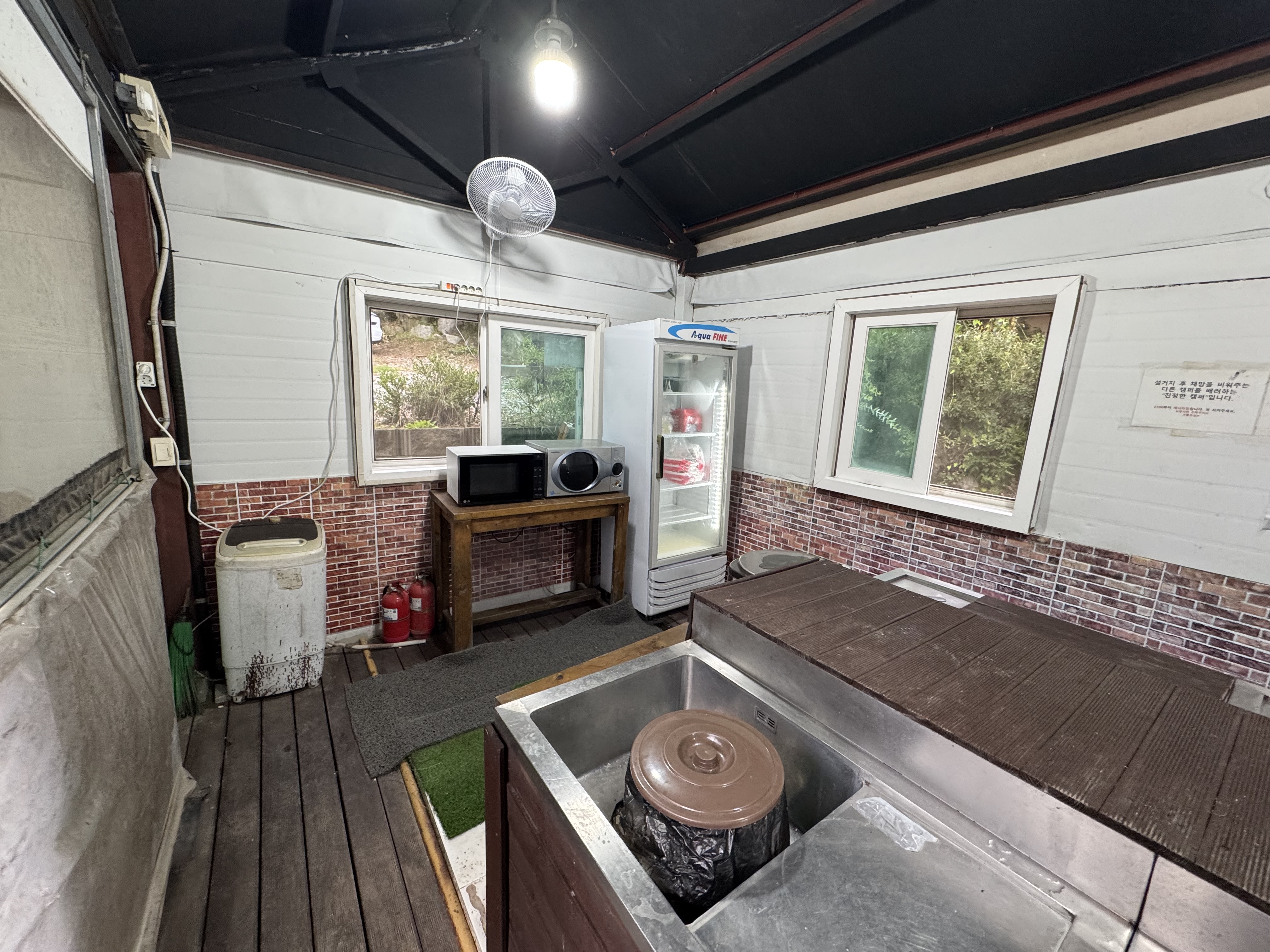 개수대는 관리가 상당히 잘 되어 있으며 화로대 세척장은 외부에 있다. 냉장고 큰 사이즈가 비치되고 전자레인지도 2개이다.
